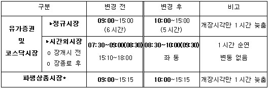 □ 정규시장 (주식, 상장지수펀드, 주식워런트증권, 채무증권 등) o 평소보다 1시간 늦은 10시에 개장하며, 종료시각은 동일(10:00-15:00)