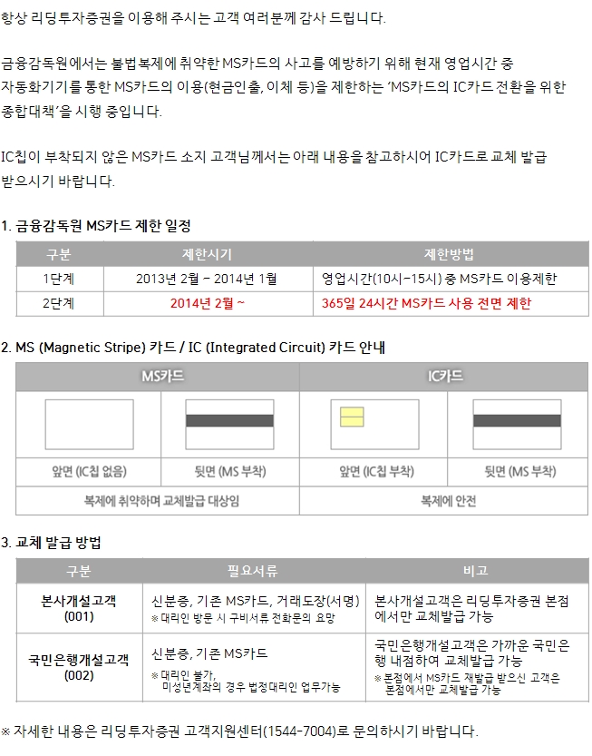 MS카드 거래제한에 따른 IC카드 교체발급 안내