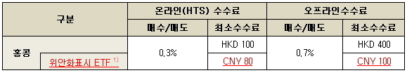 당사 해외주식 거래수수료 중 ‘홍콩거래소에 상장된 위안화표시 ETF’ 의 최소수수료가 다음과 같이 적용되오니 거래에 참고하여 주시기 바랍니다.