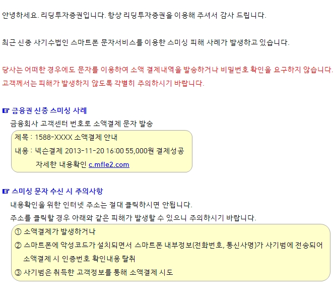 금융기관 사칭 스미싱 금융사기 주의 안내