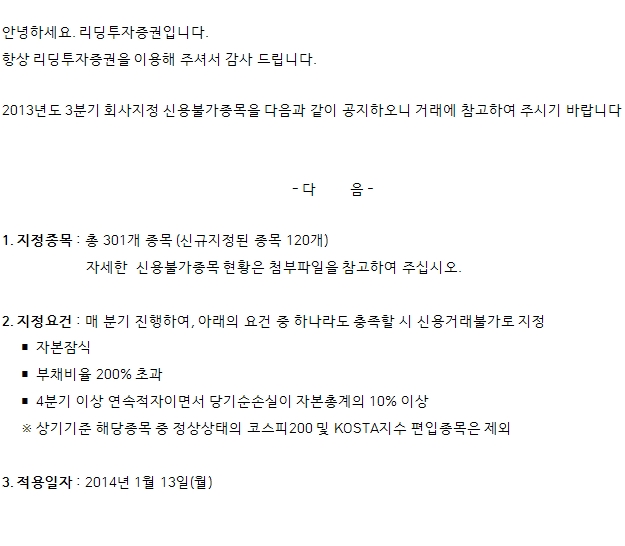 2013년도 3분기 회사지정 신용불가종목 안내