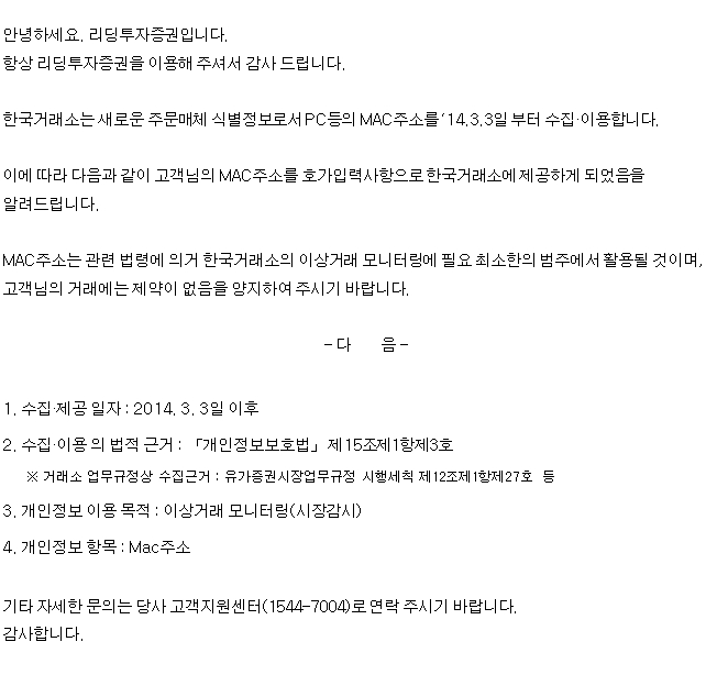 한국거래소 주문매체 식별정보(Mac주소) 제공 안내