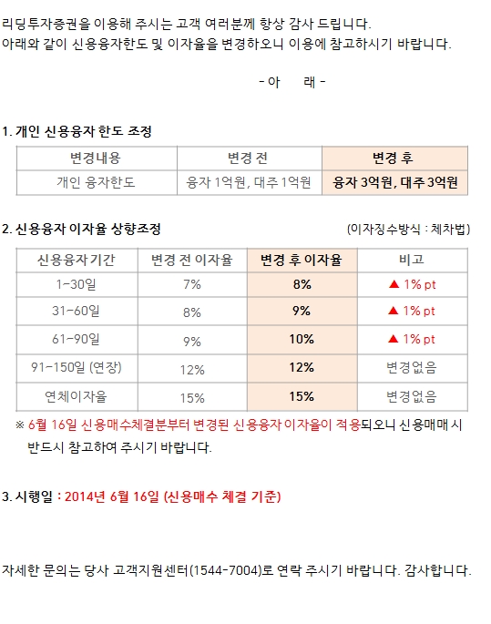 개인 신용한도 및 신용융자 이자율 변경 안내
