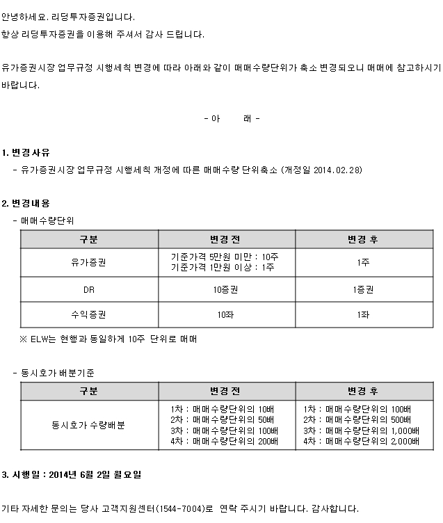 유가증권시장 매매수량단위 축소 변경 안내
