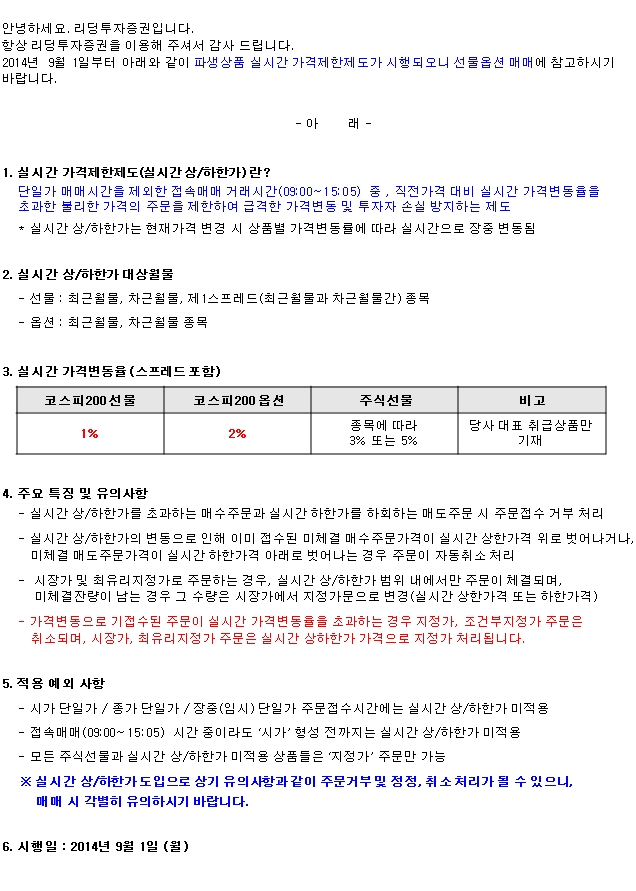 파생상품 실시간 가격제한 제도 신설 안내